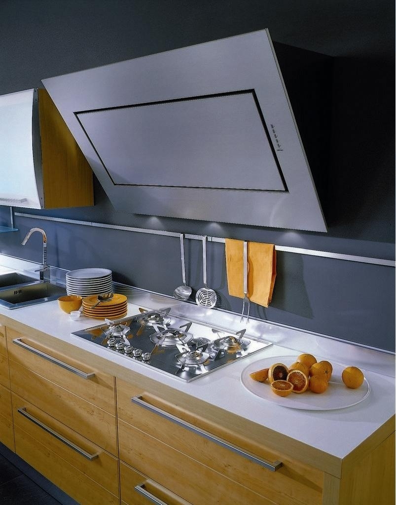Нержавеющая сталь AISI 304. Отделка с «эффектом щетки». Металлический антижировой фильтр, съемный и моющийся. Угольный фильтр. Оптическая сенсорная панель управления вытяжкой.