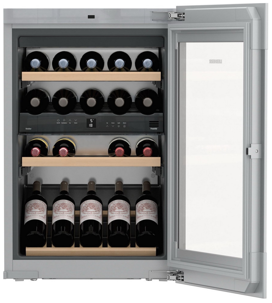 Встраиваемый винный шкаф Liebherr EWTgb 1683. Винный шкаф серии Vinidor обладает достаточной универсальностью, при этом температура в каждой из двух температурных зон шкафа устанавливается независимо от остальных зон в диапазоне от +5 °С до +20 °С. Вместимость: 33 бутылки "Бордо" по 0.75 л. Циркуляционное охлаждение. Фильтр из активированного угля FreshAir: сменный.
