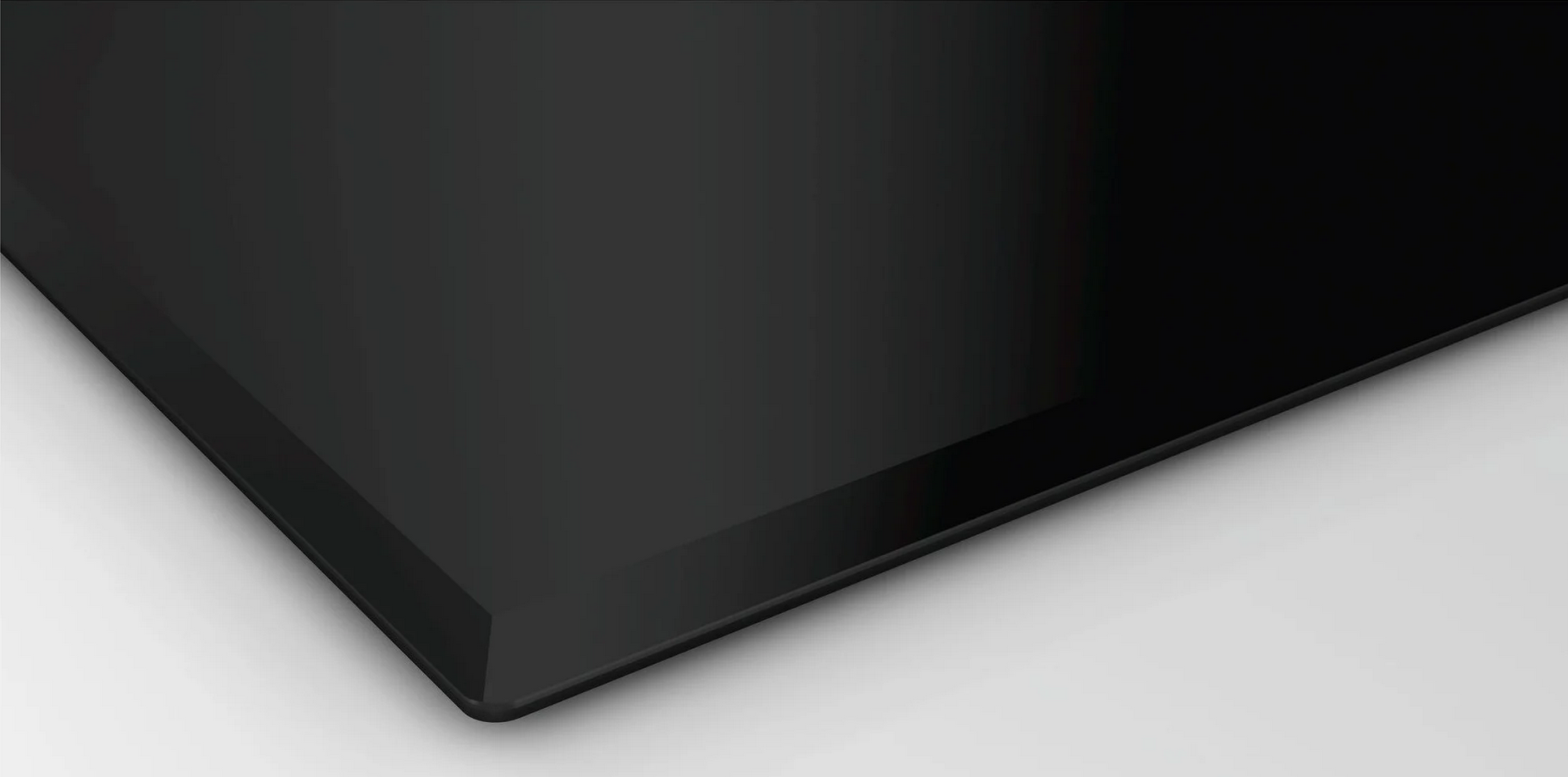 Индукционная варочная панель Bosch PVW851FB5E черного цвета. Защитное отключение конфорок, индикатор остаточного тепла, кнопка блокировки панели.